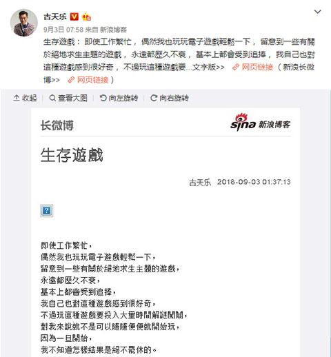 | 近日,古天乐在微博表示“即使工作繁忙,偶然我也会玩玩电子游戏轻松一下”。其中提到了当下非常热门的游戏《绝地求生》看样子也要加入“吃鸡”的队伍中了呀!
